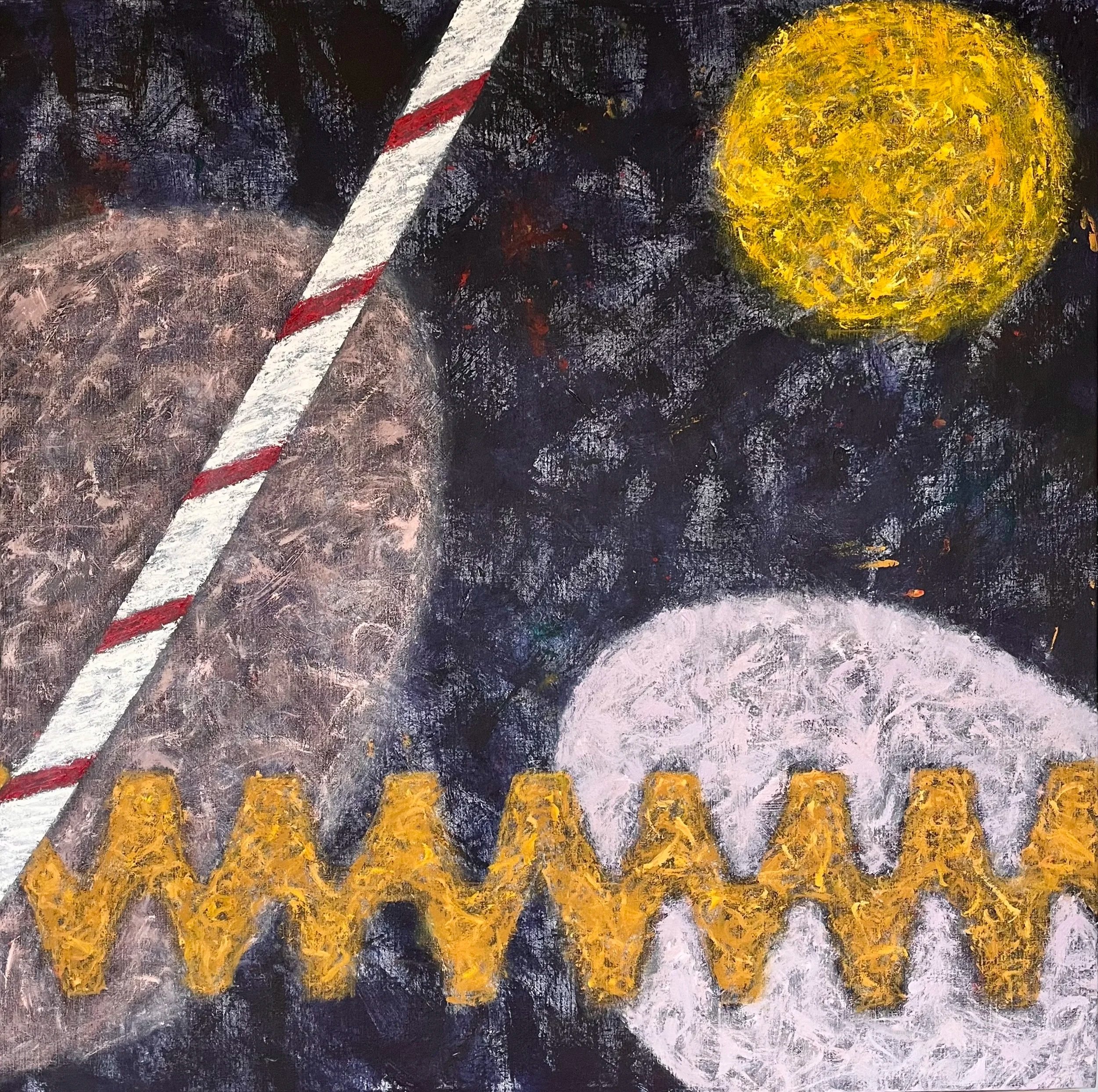 Running parallel to the saturated consumer aesthetics of the YOLKO series, this body of work shifts focus toward material intervention and physical process. Maintaining the use of open-ended emblems such as the egg and the circle, these paintings discard the flat finish of commercial branding to explore systemic fragility through tactile surfaces.