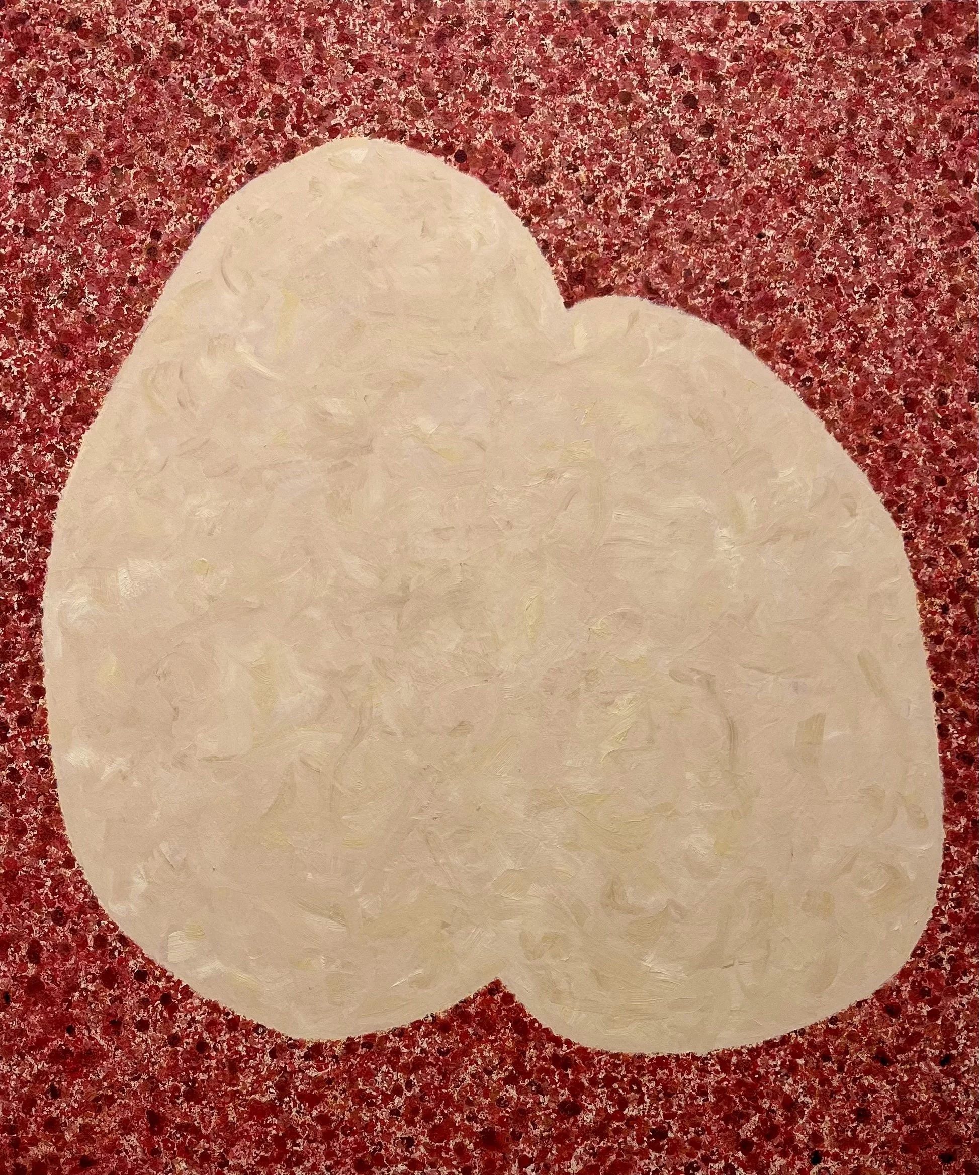 This repetitive process mirrors a mechanical conveyor belt, turning the studio into a site of reproduction. Referencing Hannah Arendt’s concept of the 'banality of evil', the methodology explores how mechanisms of control can be embedded within ordinary domestic objects. On the raw wood panel of Counterbalance, neutral, glazed tones surround two central, leaning egg forms. In contrast, scaling the process up to a large canvas in Without a Second Thought alters the visual register. The stamped red circles multiply to form a dense visual noise, mapping the relentless pace of mass consumption against softer, organic forms. As the scale increases, these central motifs become deliberately less precise. Rendered in heavily textured, bodily tones, the forms lose their rigid borders. This intentional lack of definition allows the physical weight of the paint to evoke a visceral, human presence, contrasting sharply with the mechanical repetition of the stamped grid.
